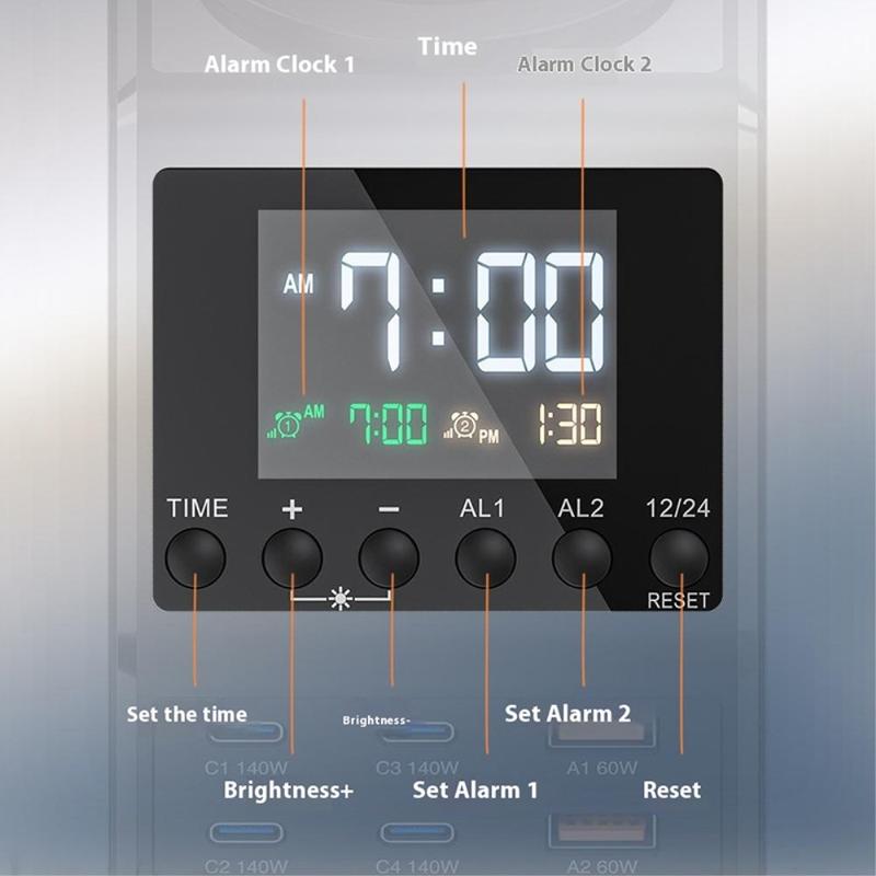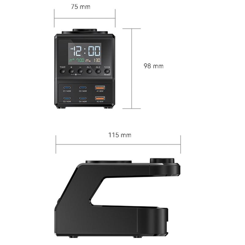 - Design multifuncional 6 em 1 - Combina despertador, carregador sem fios e estação de alimentação multiportas.