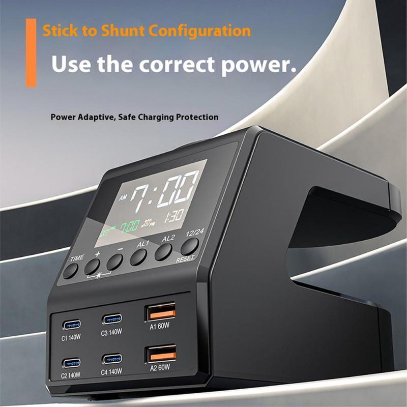 Estação de carregamento sem fios HHW H688 6 em 1 com relógio despertador - Carregador multiporta de 240W com saída sem fios de 15 W e ficha UE