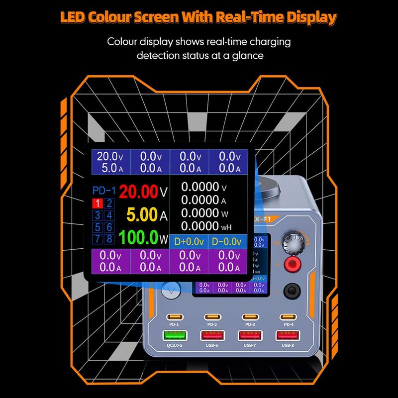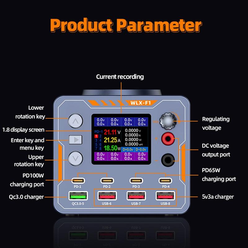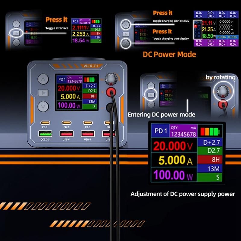 Com uma saída de até 100 W numa única porta, o WLX-F1 alimenta eficazmente dispositivos de elevada procura, como MacBooks e computadores portáteis com USB-C. Também possui uma saída DC de precisão ajustável (1,8-12V, 2A), tornando-o ideal para testar, reparar e diagnosticar equipamento eletrónico.