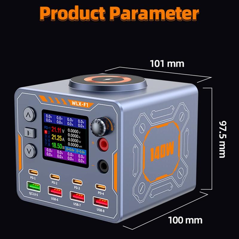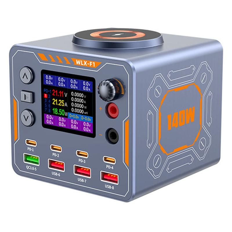A fantástica estação de carregamento multi-dispositivo WLX-F1 140W é um carregador de secretária potente e versátil, concebido para computadores portáteis, telemóveis, tablets, dispositivos portáteis e até mesmo para a reparação de aparelhos electrónicos. Equipada com 8 opções de carregamento, incluindo quatro portas de carregamento rápido PD, uma porta QC3.0, três portas USB e uma almofada de carregamento sem fios de 15 W, oferece uma solução de carregamento completa para ambientes domésticos, de escritório ou de oficina.