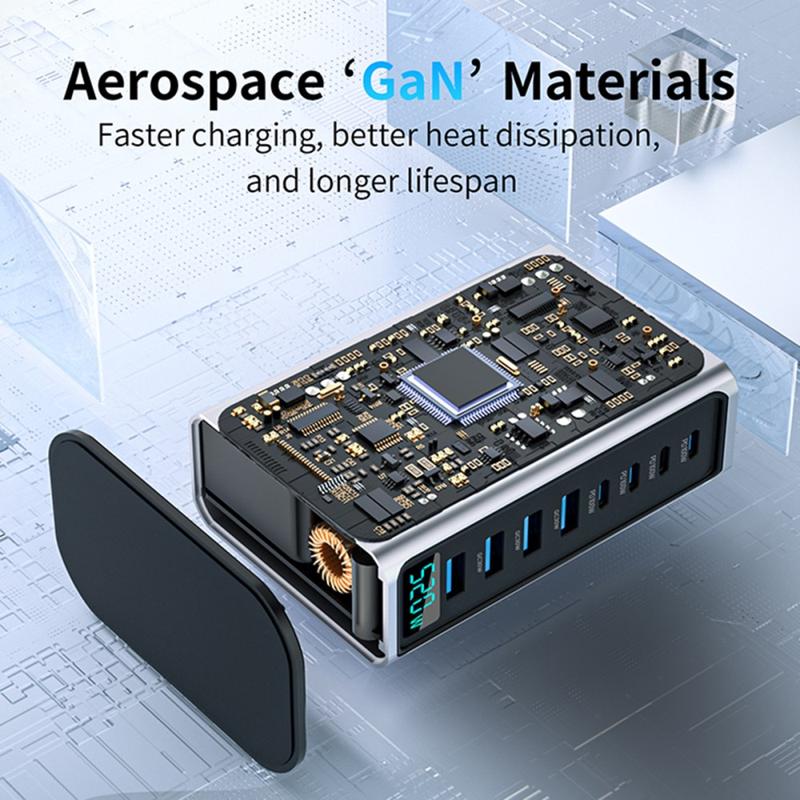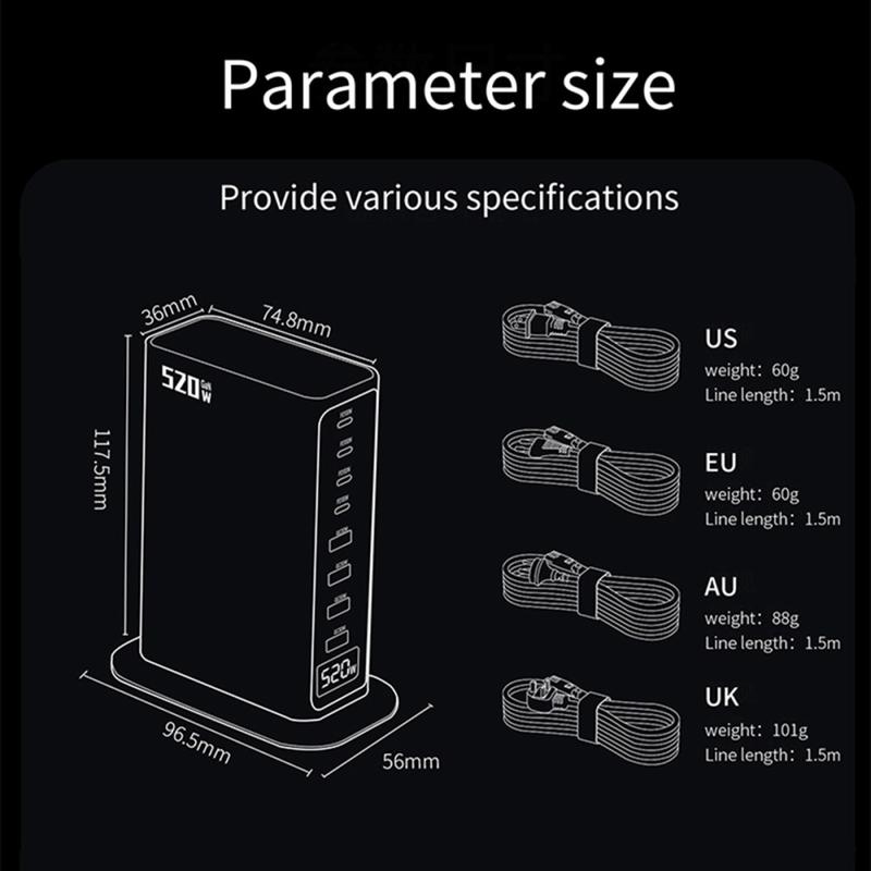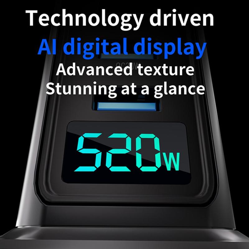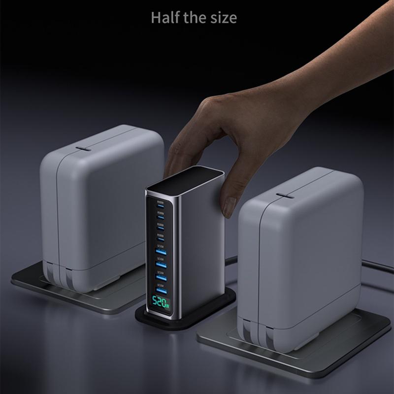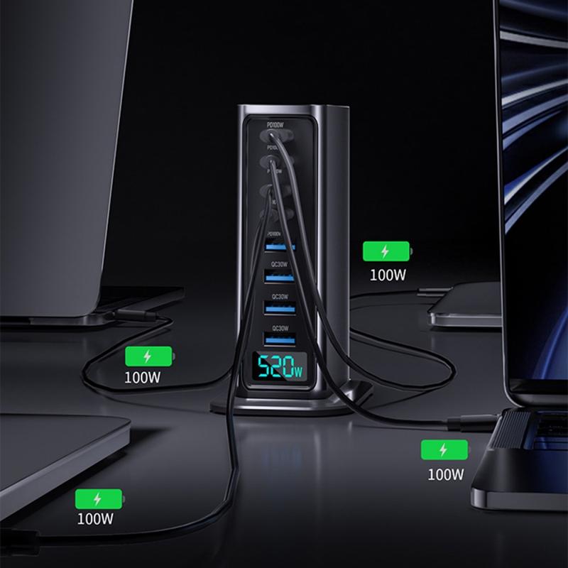 Estação de carregamento de secretária GaN 5.0 de 520W com ecrã digital de energia - 8 portas (4x USB-C até 100 W + 4x USB-A) Carregador rápido, PPS/PD/QC