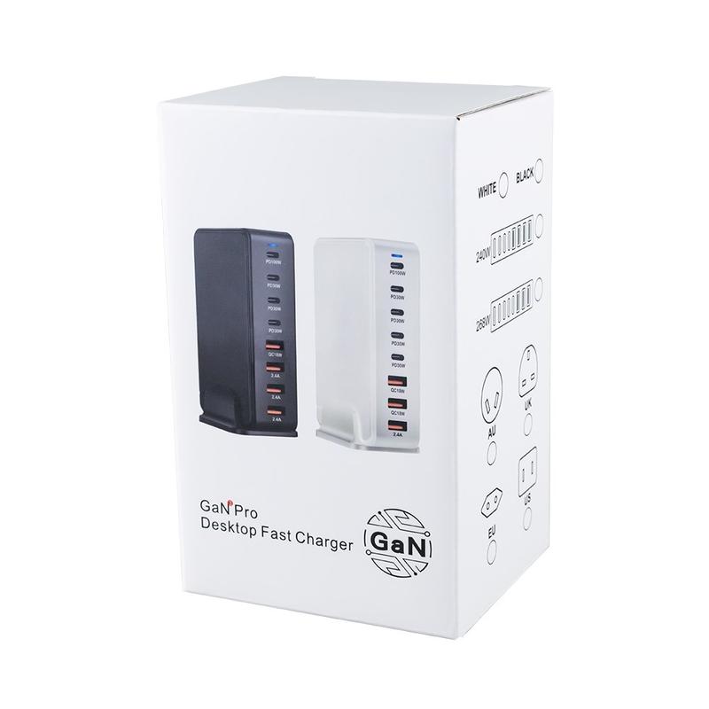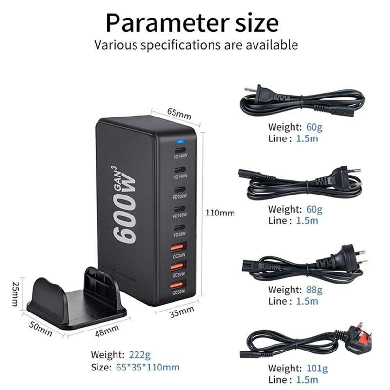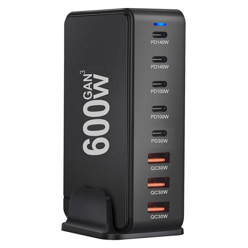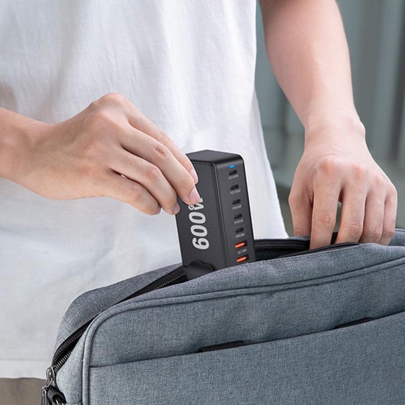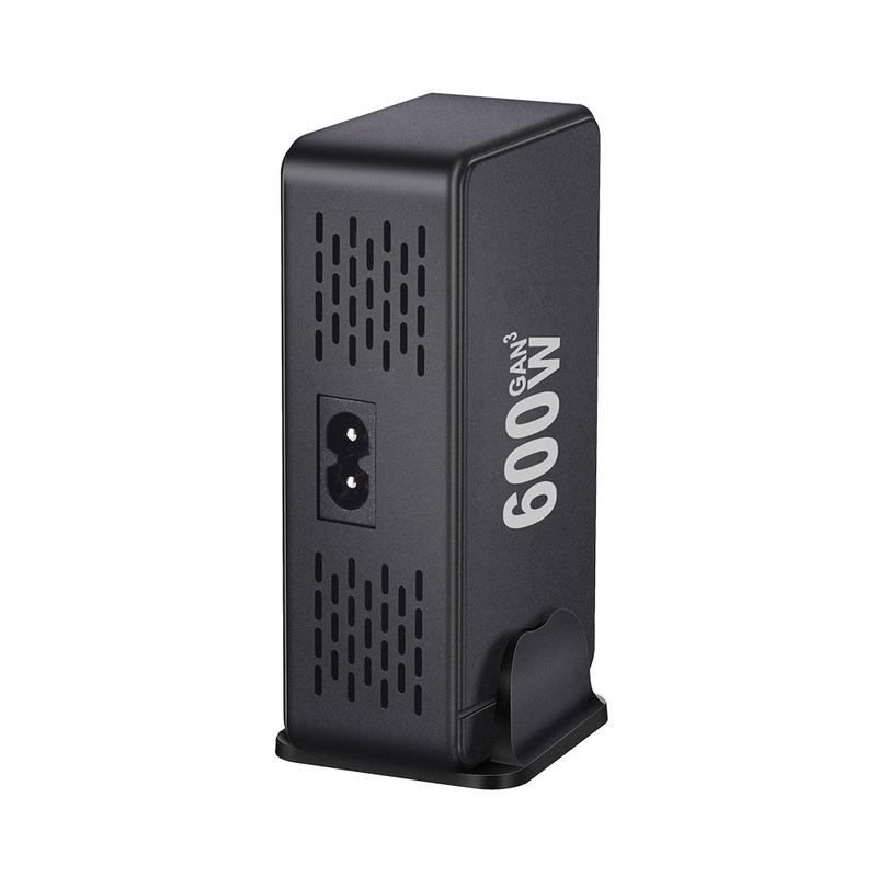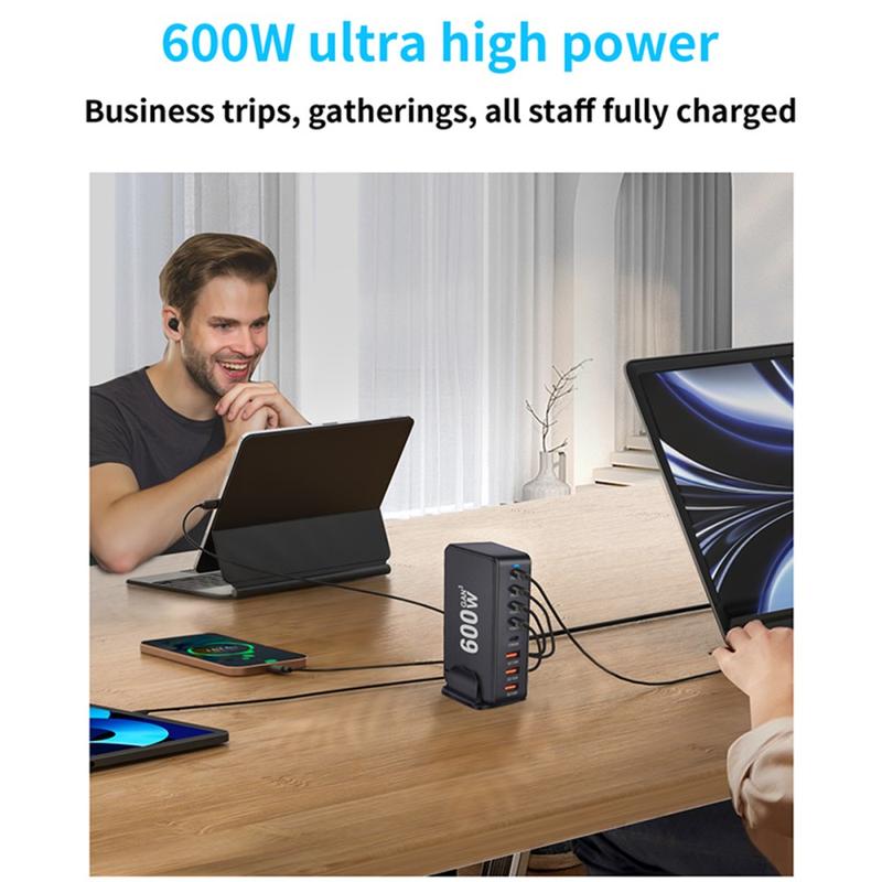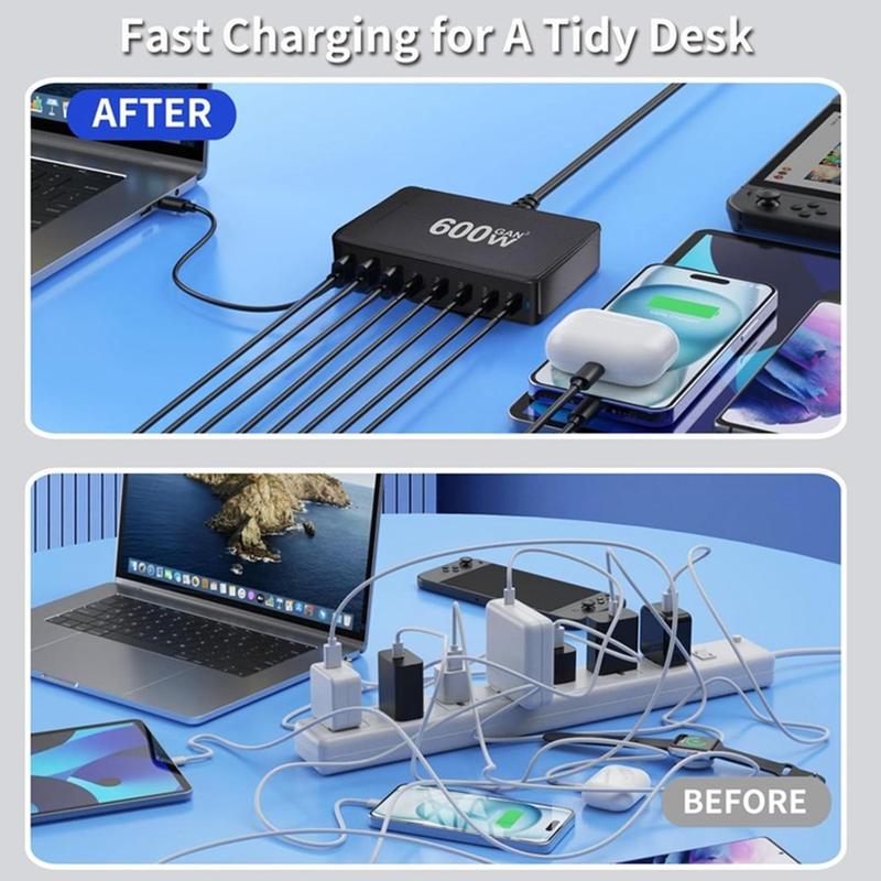 Estação de carregamento de secretária 600W GaN - 8 portas (5x USB-C + 3x USB-A) Carregador rápido PD3.1, até 140W USB-C, distribuição inteligente de energia