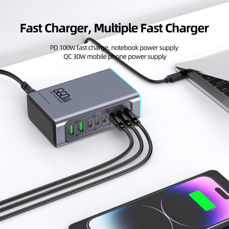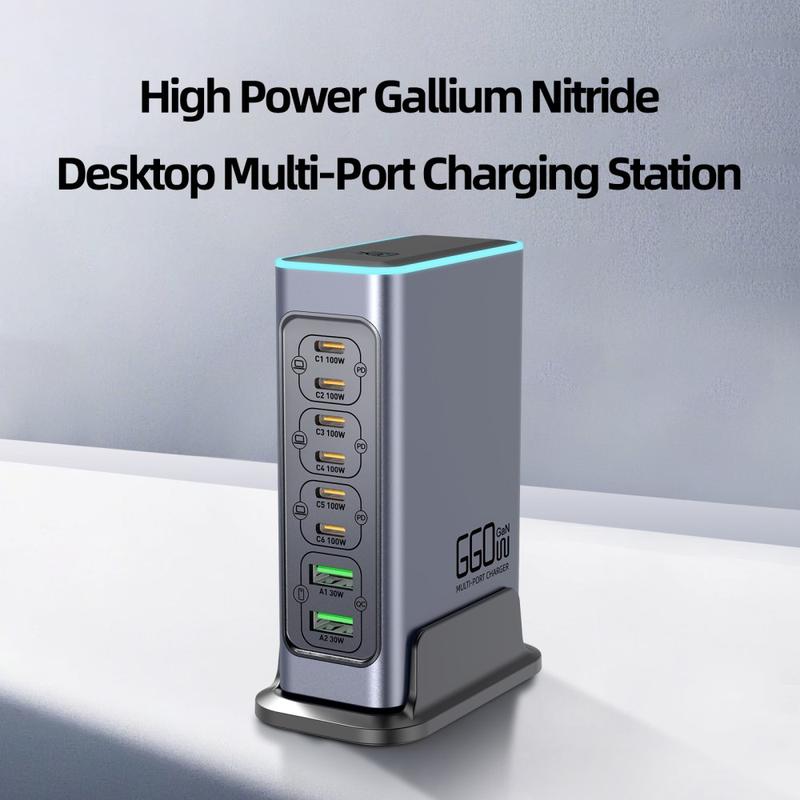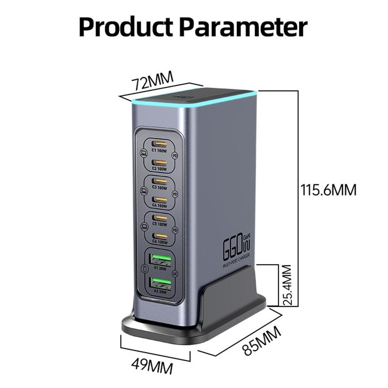 Estação de carregamento de secretária WLX-F8L de 8 portas GaN 660W - 6xUSB-C PD, 2xUSB-A QC3.0, 100-240 V, hub de alimentação compacto com ficha UE