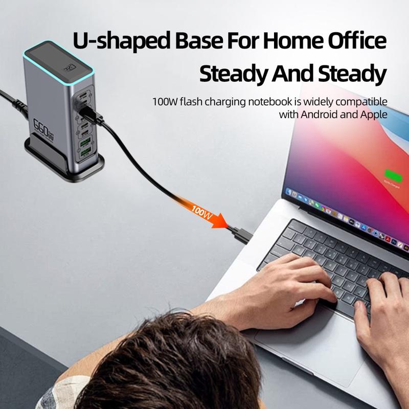 Substitua uma secretária cheia de carregadores por um hub de alta potência. A estação de carregamento de secretária WLX-F8L GaN foi concebida para configurações com vários dispositivos pesados — carregando computadores portáteis, tablets, telemóveis, power banks, auscultadores e muito mais ao mesmo tempo. Com seis portas USB-C que suportam perfis Power Delivery até 20 V/5 A e duas portas USB-A com QC3.0, foi concebida para fornecer carregamento rápido e eficiente a uma vasta gama de dispositivos, mantendo o seu espaço de trabalho mais limpo e organizado.
