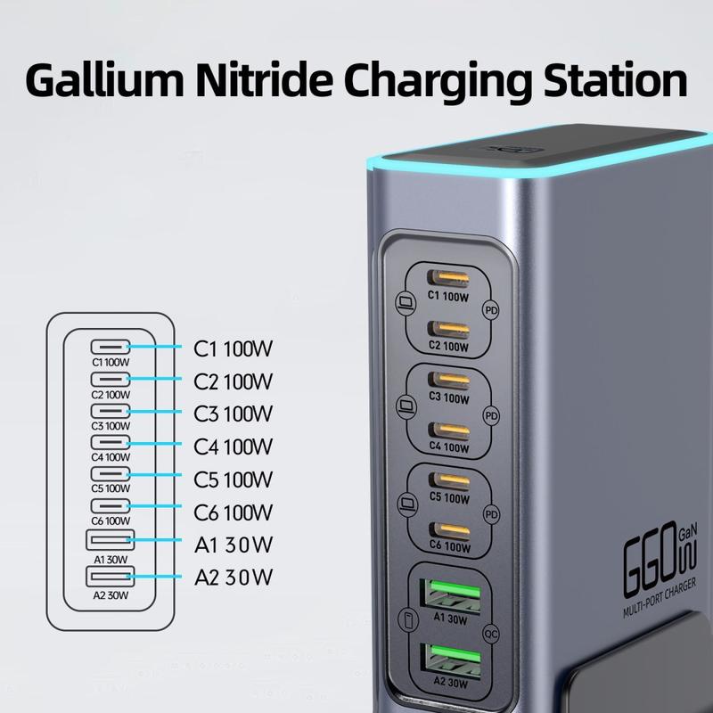 - 8 portas no total: 6 x USB-C + 2 x USB-A para carregar vários dispositivos simultaneamente