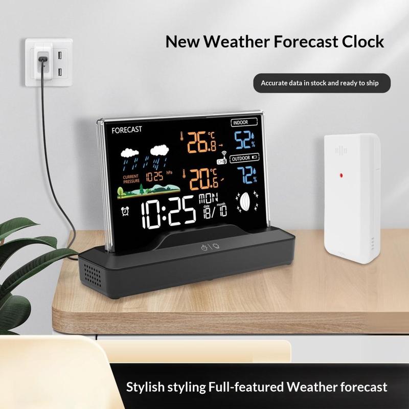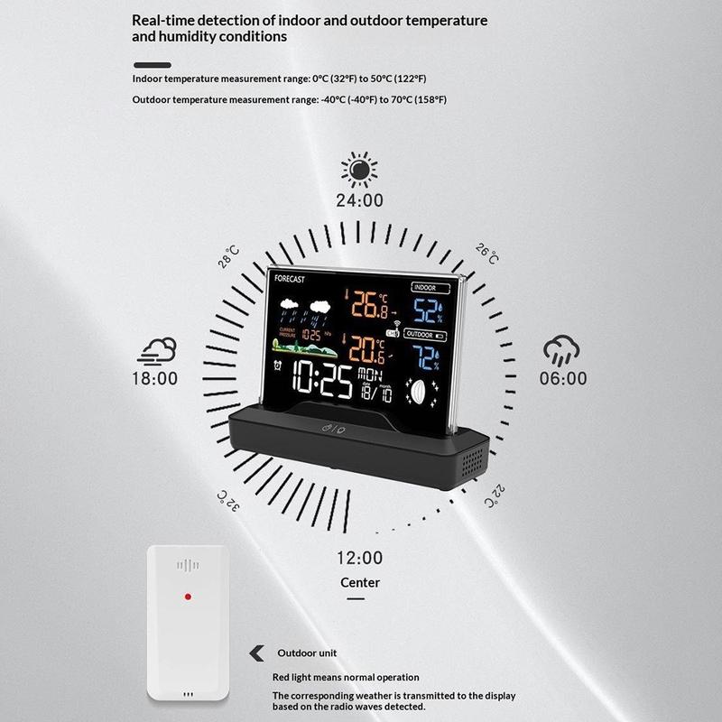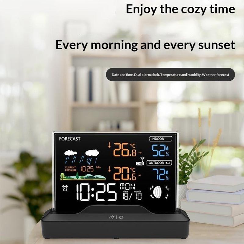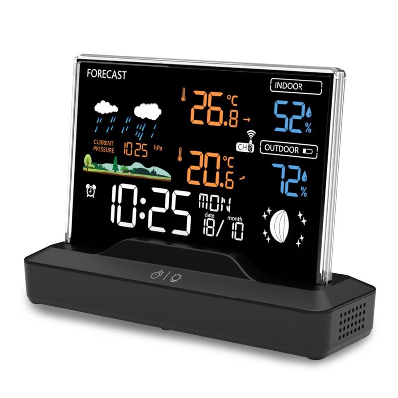 Estação meteorológica sem fios com ecrã LCD a cores, termómetro para interior/exterior, higrómetro e despertador