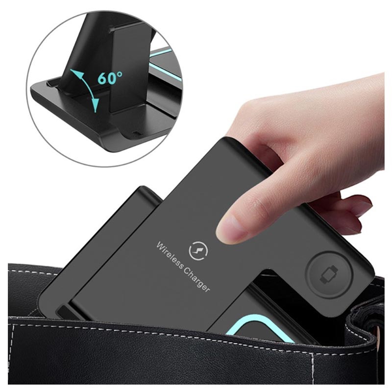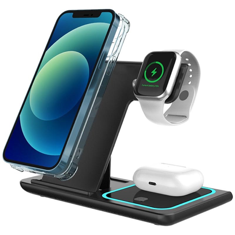 Com esta estação de carregamento 3 em 1, portátil e sem fios, é possível carregar 3 dispositivos diferentes ao mesmo tempo.