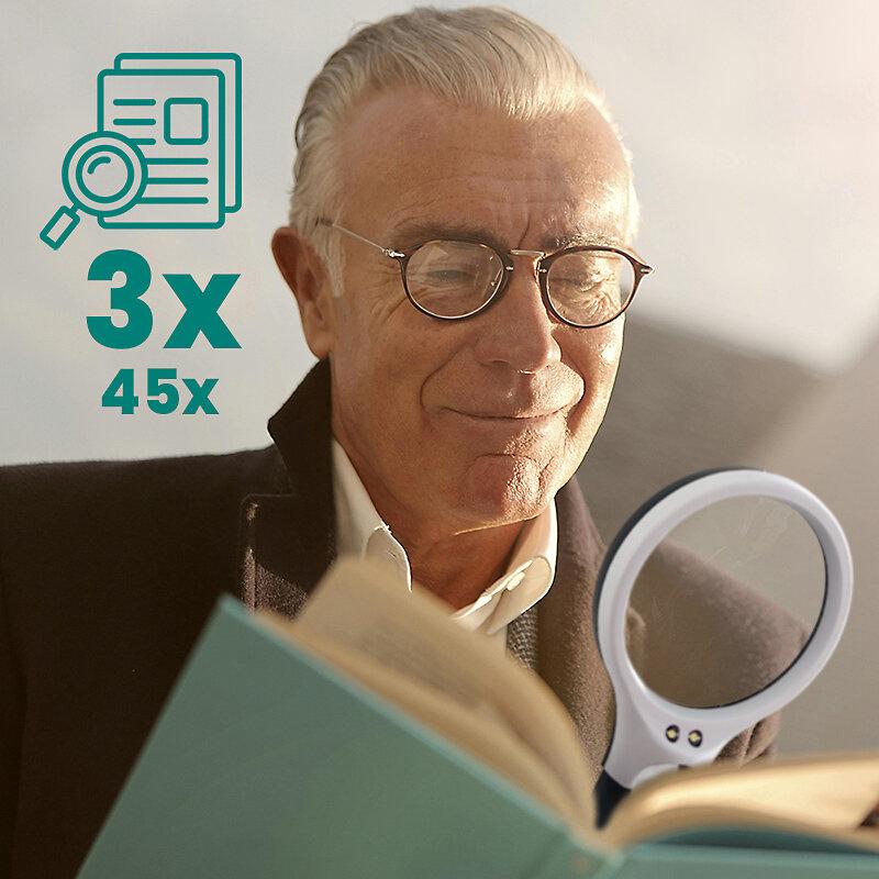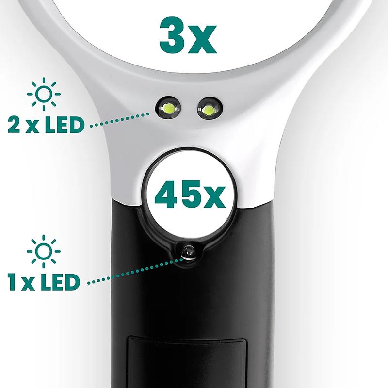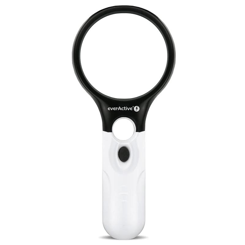 Lupa EverActive MG-01 com retroiluminação LED - Lente grande 3x e mini-lente 45x, alimentada por pilhas AAA 3x