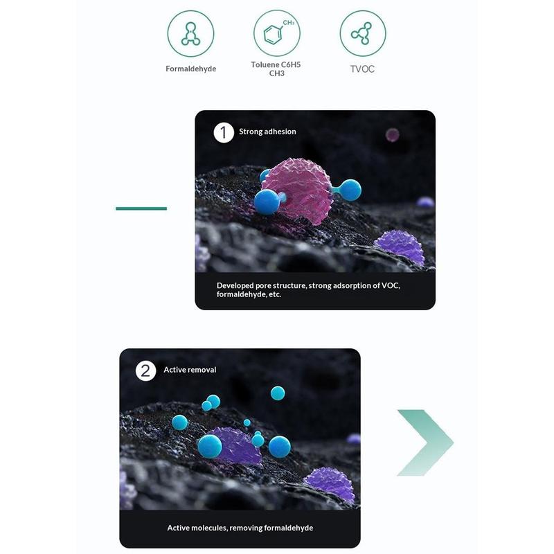 - O carvão ativado catalítico ajuda a absorver formaldeído, tolueno e compostos TVOC