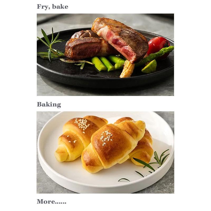 - Utiliza pouco ou nenhum óleo, promovendo uma cozedura mais saudável e mantendo a textura estaladiça
