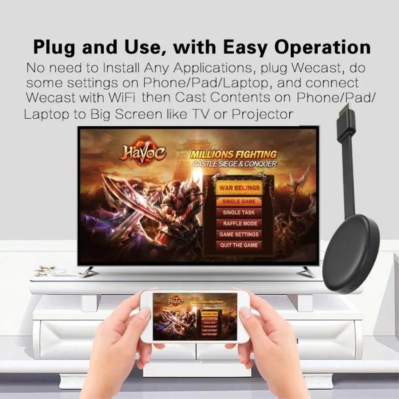 - Funcionamento Plug & Play - Simples de configurar - basta ligar o dongle à sua porta HDMI, alimentá-lo através de USB e ligar através de WiFi.