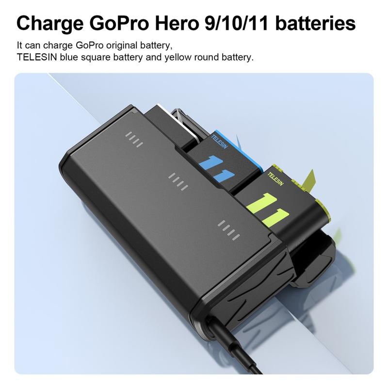 TELESIN GP-HPK-011 Carregador de bateria com 3 ranhuras e armazenamento de cartão TF para GoPro Hero 9, GoPro Hero 10, GoPro Hero 11