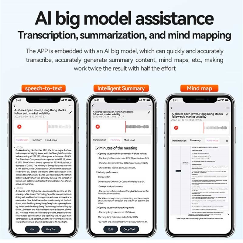 Transcrição com tecnologia de IA: Ligue-se ao AIREC-APP via Bluetooth para desfrutar de transcrição e tradução em tempo real em 188 idiomas com integração com ChatGPT.