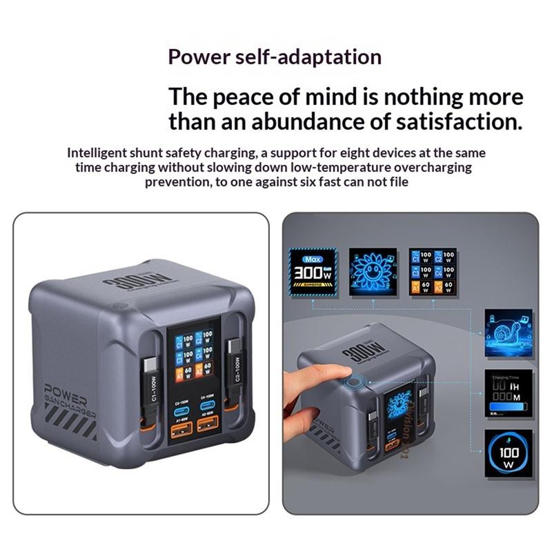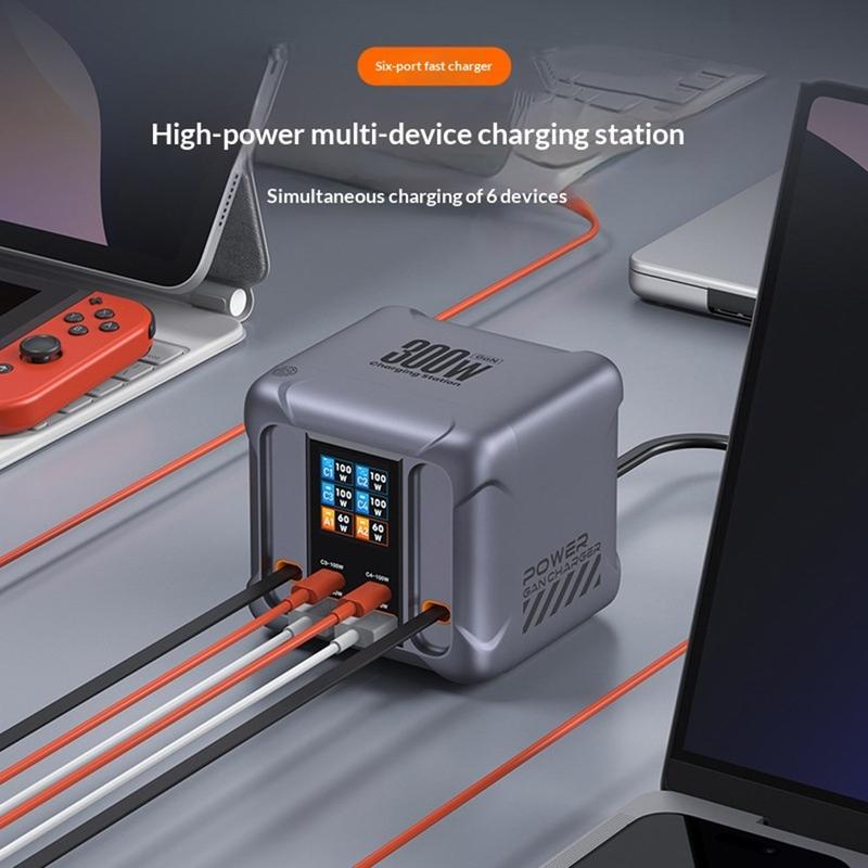 HW866 - Estação de carregamento de secretária GaN de 300W com ecrã LCD - Carregador de 6 portas com 2 cabos USB-C retráteis, ficha UE