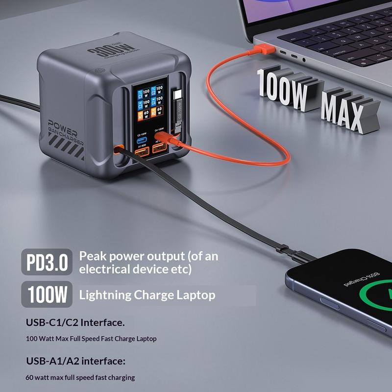 - Potência total de saída até 300W para alimentar vários dispositivos a partir de um único carregador de secretária