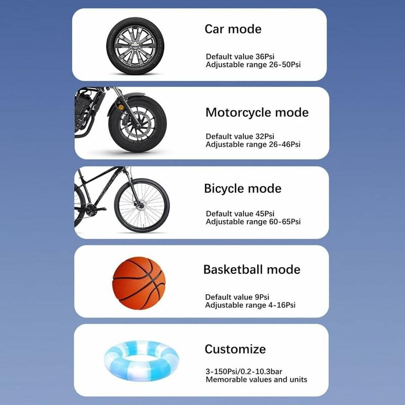 - Potência de alta pressão: Infla até 150 PSI, adequado para uma vasta gama de tamanhos de pneus.