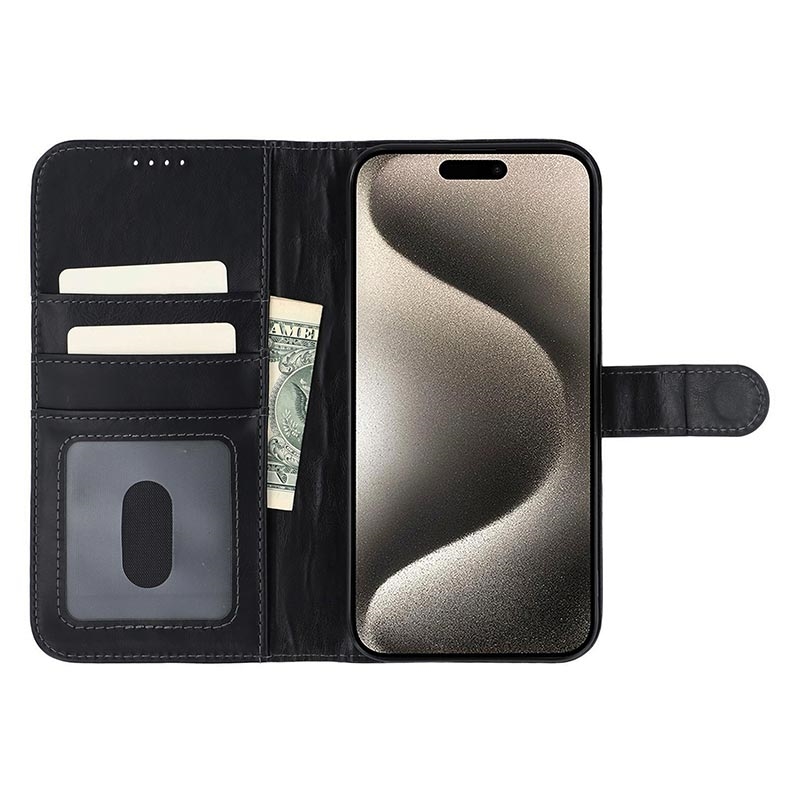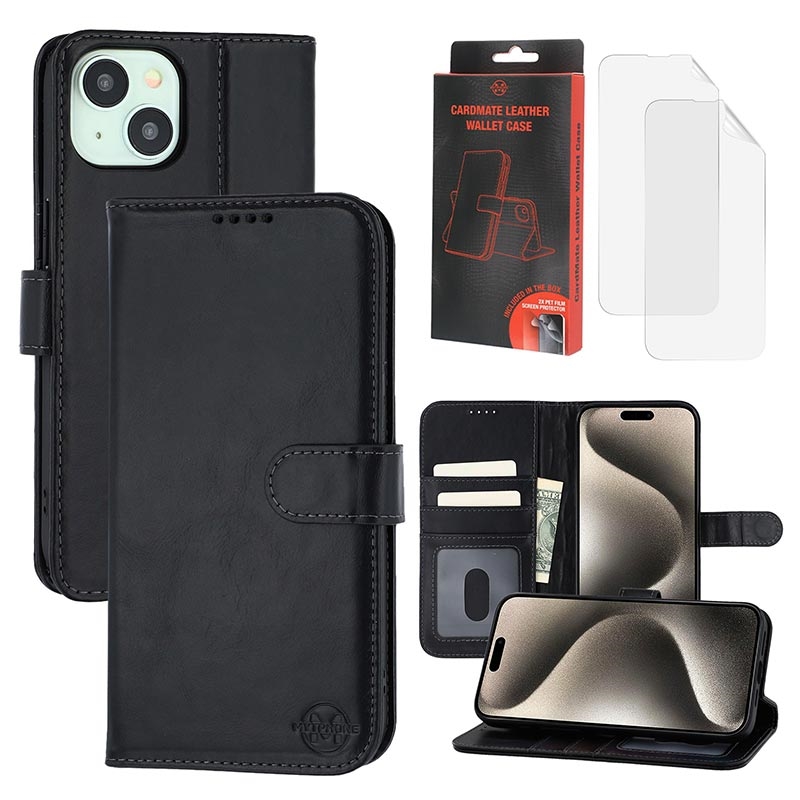 • Capa de couro para carteira MyTPhone CardMate Premium para iPhone 15 - Suporte de pé, suporte para cartões, suporte para carregamento sem fios, 2 protecções de ecrã
