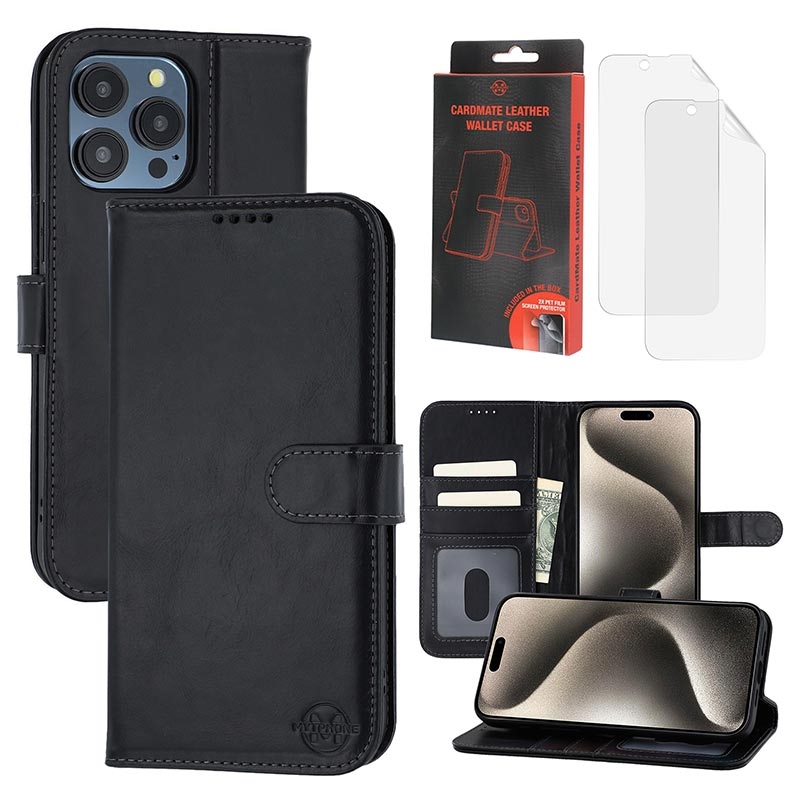 Capa de couro para carteira MyTPhone CardMate Premium para iPhone 15 Pro - Suporte de pé, suporte para cartões, suporte para carregamento sem fios, 2 protecções de ecrã
