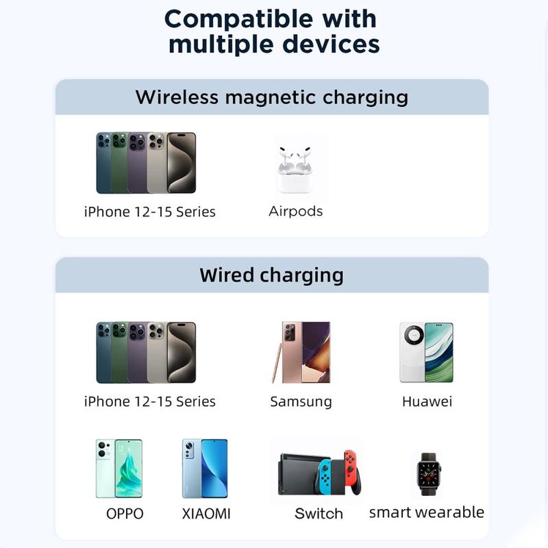 Inclui um cabo amovível, que permite carregar três dispositivos com um só cabo, incluindo dispositivos Apple/Android/auto-carregamento