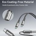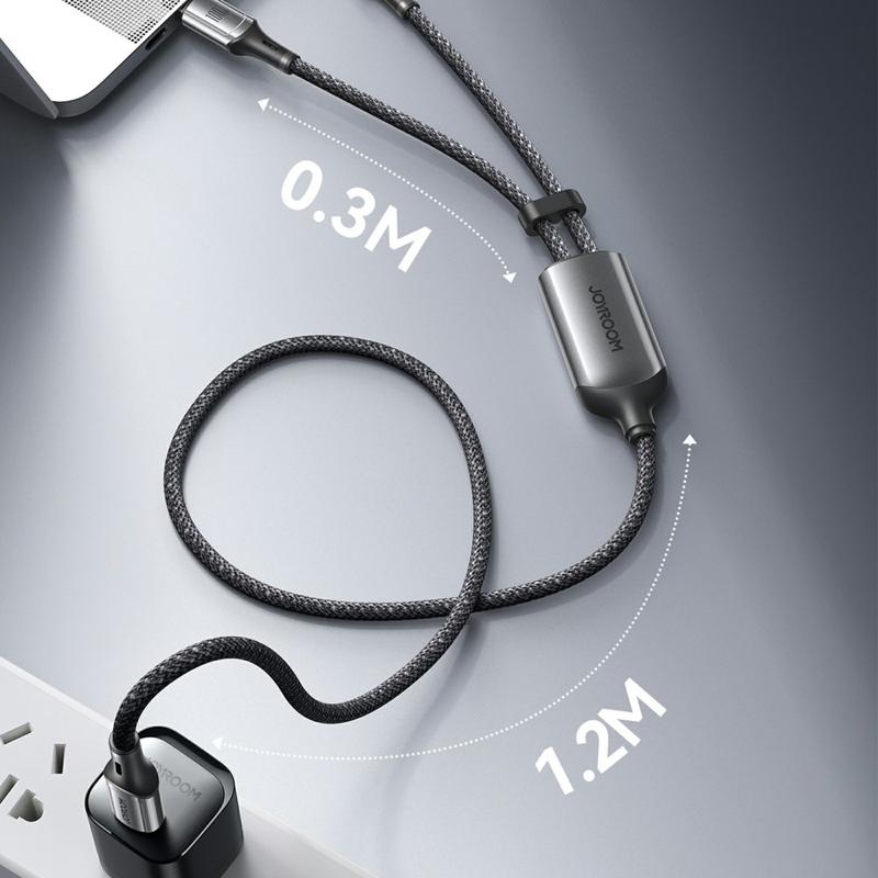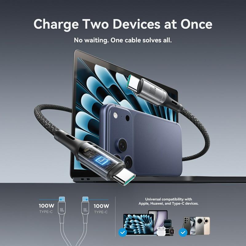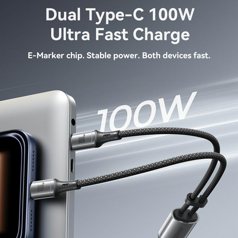 Carregue dois dispositivos USB-C ao mesmo tempo com o cabo JOYROOM S-A57 USB-C para USB-C duplo. Concebido para computadores portáteis, tablets e smartphones modernos, suporta um carregamento rápido de até 100 W e utiliza um chip de gestão inteligente E-Marker para ajudar a fornecer energia estável a dispositivos compatíveis. Também obtém uma transferência de dados de 480 Mbps para sincronização diária, pelo que um cabo cobre tanto o carregamento como as transferências de ficheiros. A construção entrançada de nylon durável de 48 fios foi concebida para resistir à abrasão e à flexão diária, enquanto a braçadeira organizadora de cabos incluída mantém a sua configuração organizada na secretária ou numa mala. Com caraterísticas de durabilidade testadas, como mais de 10.000 inserções e uma capacidade de carga de 7 kg, foi concebido para uma utilização frequente.