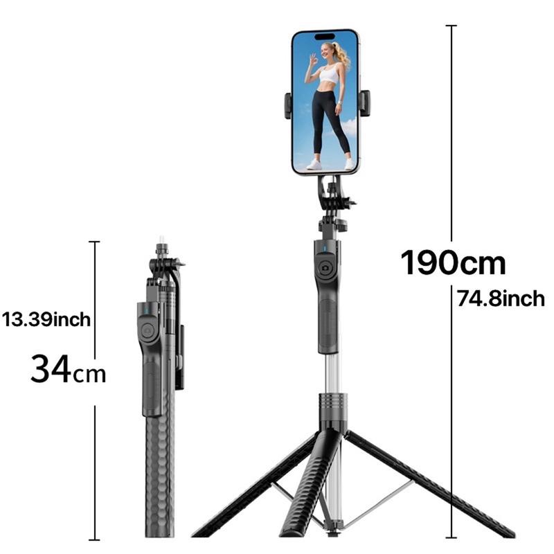 - Tripé extensível de 1,9 M - Expande-se até 190 cm para filmagens amplas ou fotografias de grupo; desce até 34 cm para portabilidade.