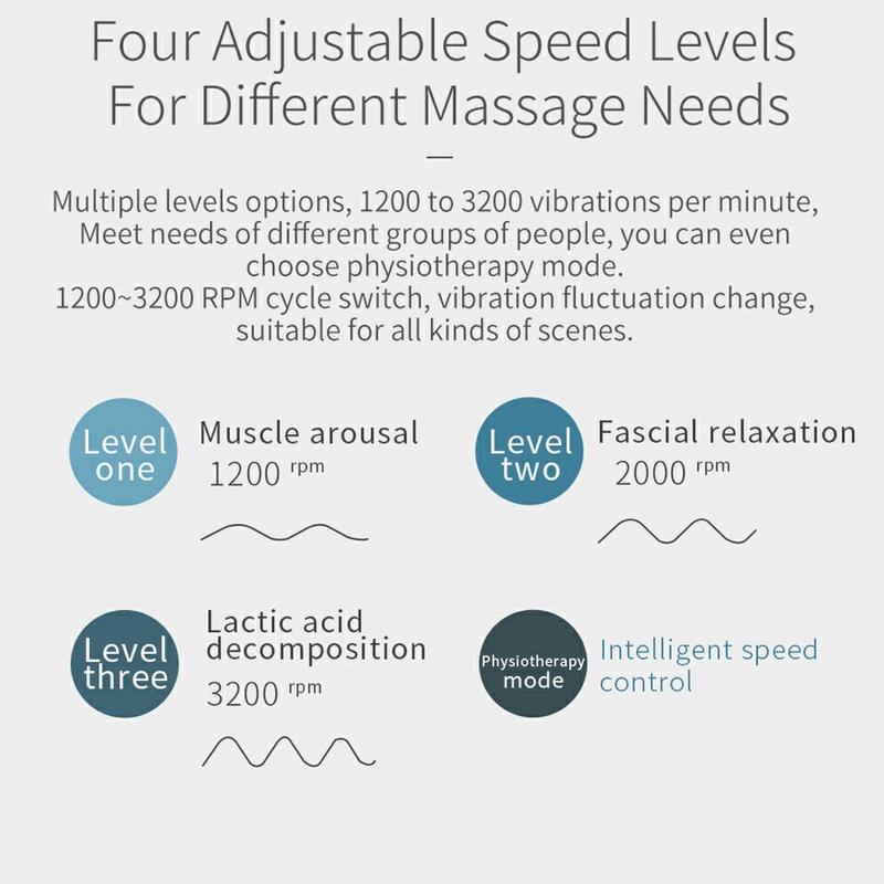 - Quatro níveis de velocidade ajustáveis: Personalize a sua experiência de massagem com quatro níveis de velocidade, permitindo-lhe ajustar a intensidade para se adequar a diferentes grupos musculares e preferências pessoais.