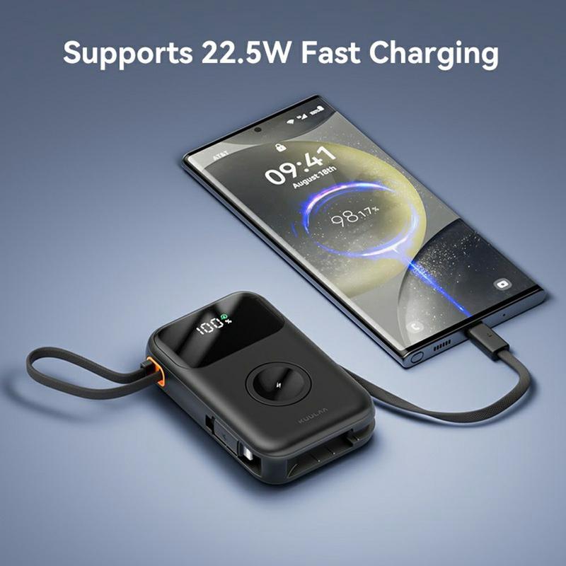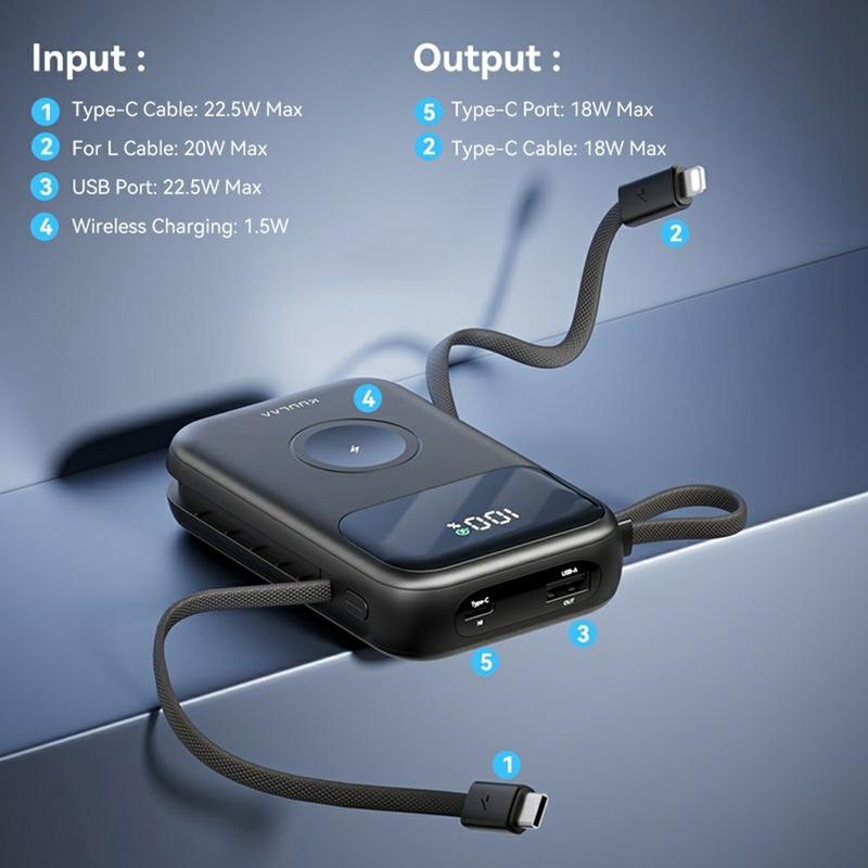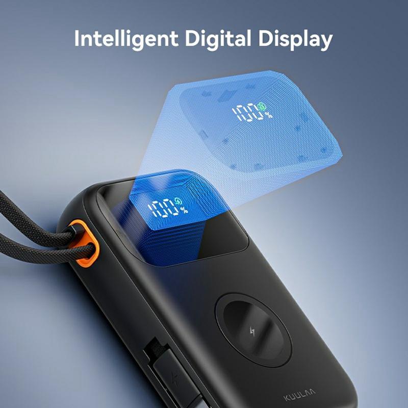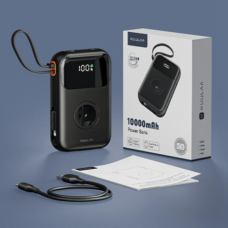 Mantenha os seus dispositivos ligados em qualquer lugar com o Power Bank Kuulaa KL-YD80 com ecrã digital. Este carregador portátil de 10 000 mAh possui dois cabos incorporados, suporte para carregamento rápido de 22,5 W e um ecrã digital inteligente, garantindo que os seus dispositivos permanecem carregados de forma eficiente e conveniente.