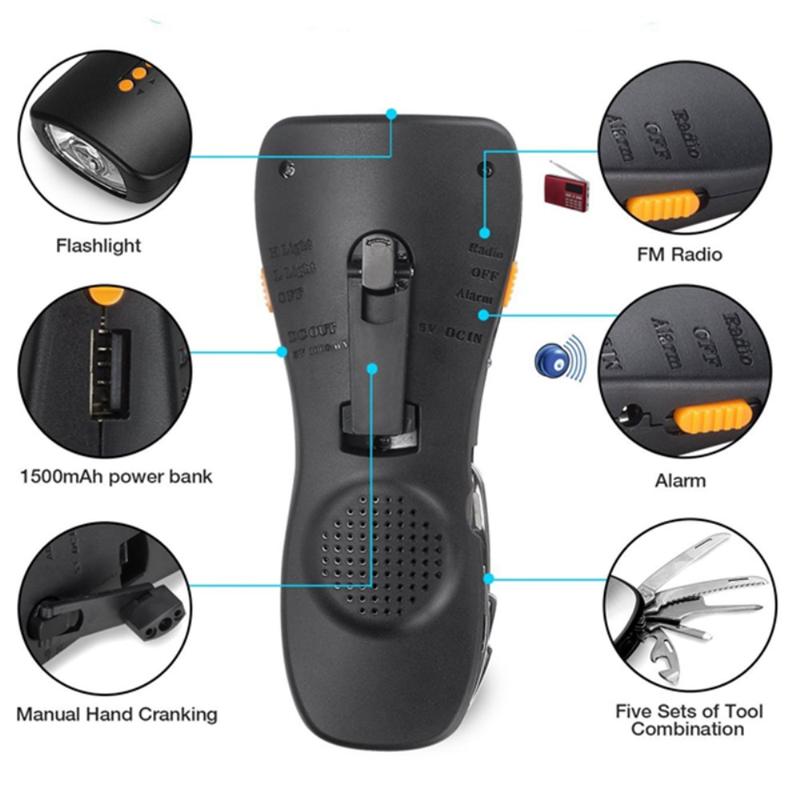 Esteja preparado para qualquer emergência com a lanterna multifunções com manivela manual, rádio FM e conjunto de ferramentas de emergência de 5 peças. Esta ferramenta fiável e versátil foi concebida para utilização em caso de emergência e é essencial para qualquer kit de sobrevivência. A função de manivela permite a produção de energia a pedido, garantindo que a lanterna, o alarme e o rádio podem ser utilizados quando as fontes de energia tradicionais não estão disponíveis. A lanterna LED de 3W de brilho ultra-elevado proporciona uma iluminação potente, enquanto o rádio FM com altifalante incorporado e áudio de alta fidelidade garante que pode manter-se informado e entretido durante uma emergência. A função de carregamento rápido de energia móvel de 1800mAh incorporada permite o carregamento rápido de dispositivos móveis, fornecendo uma linha de vida crucial durante uma crise. A função de alarme antirroubo e o conjunto de ferramentas de 5 peças acrescentam uma camada adicional de segurança e utilidade, tornando-o indispensável em qualquer kit de preparação para emergências.