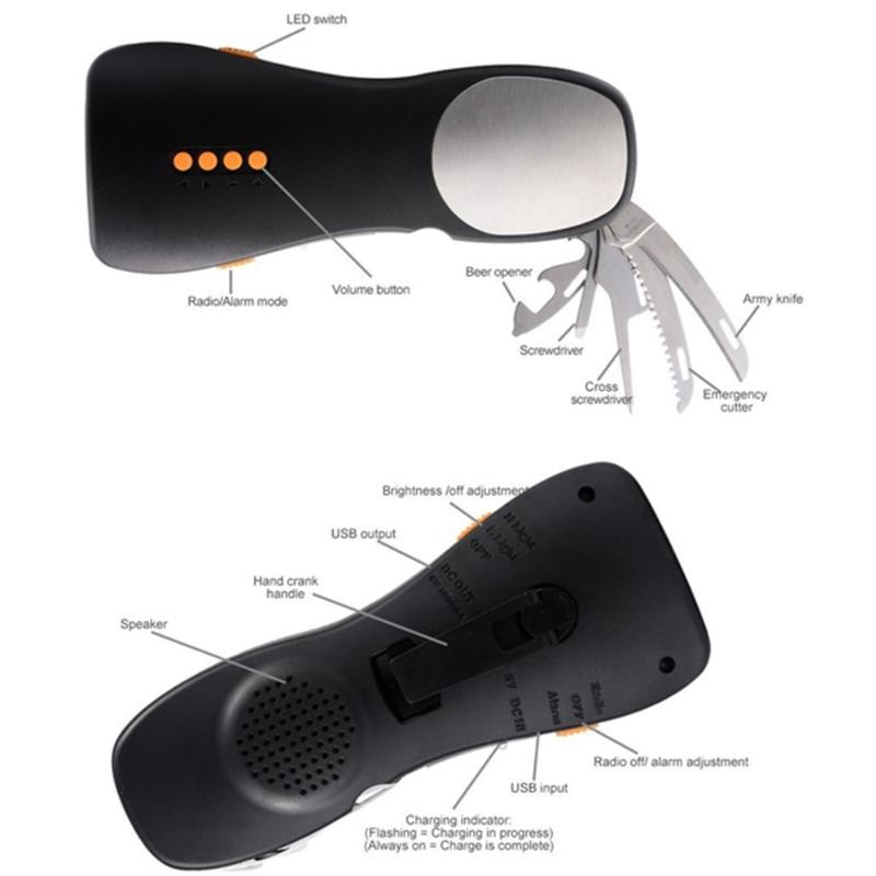 Lanterna multifunções com manivela e rádio FM, conjunto de ferramentas de emergência com 5 peças