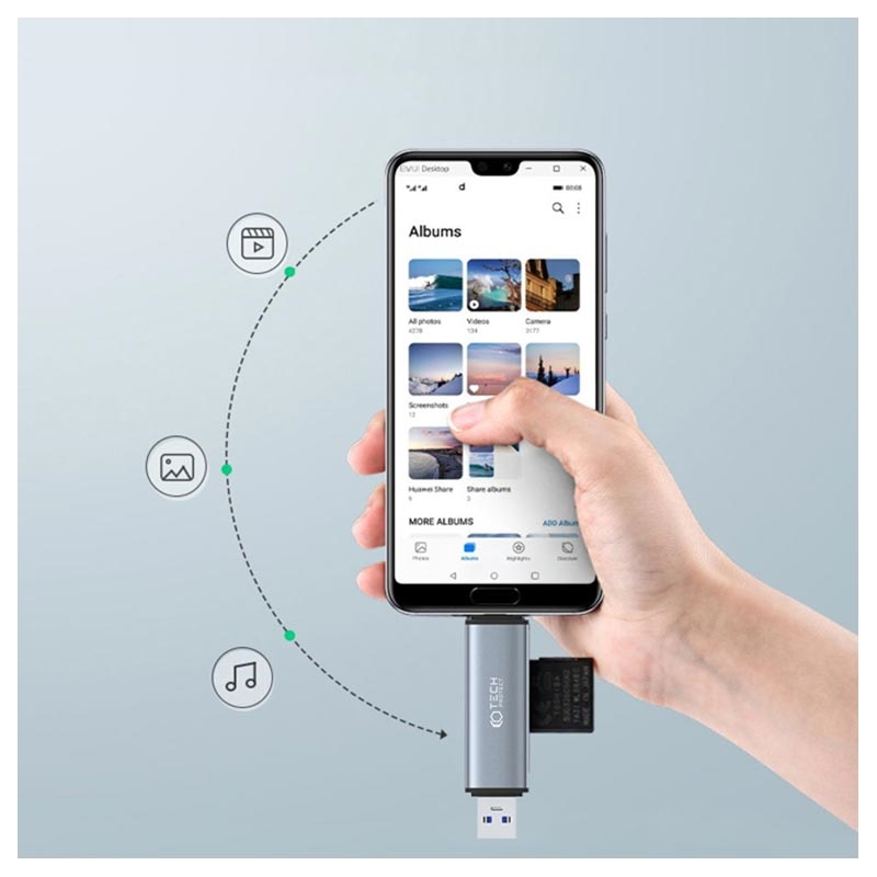 Eleve sua experiência digital com o leitor de cartão Tech-Protect UltraBoost! Quer você seja um fotógrafo profissional, um cinegrafista ou apenas alguém que guarda lembranças, este gadget é indispensável. Projetado com entradas USB-A e USB-C, é versátil o suficiente para dispositivos que vão desde smartphones e tablets habilitados para OTG até laptops e PCs.