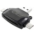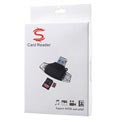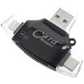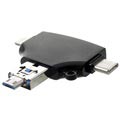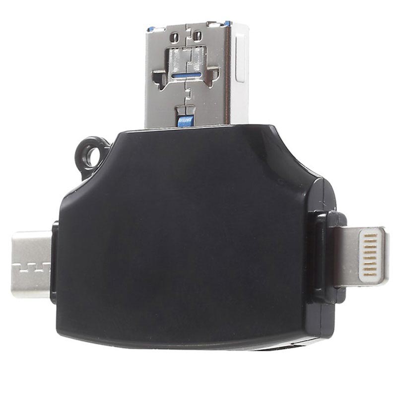 Utilize este pequeno dispositivo único para transferir convenientemente todos os vídeos e imagens essenciais entre o seu smartphone, tablet, portátil, PC, MacBook. Este leitor de cartões multifuncional é adequado para a maioria dos cartões de memória microSD / SD, e possui 4 conectores de saída diferentes: microUSB, USB-A 2.0, Type-C e porta lightning de 8 pinos. Utilize cada uma das portas para o seu dispositivo dedicado e desfrute de uma transferência de dados super conveniente. O leitor de cartões é muito pequeno e portátil, por isso pode tê-lo sempre ao seu lado onde quer que vá.