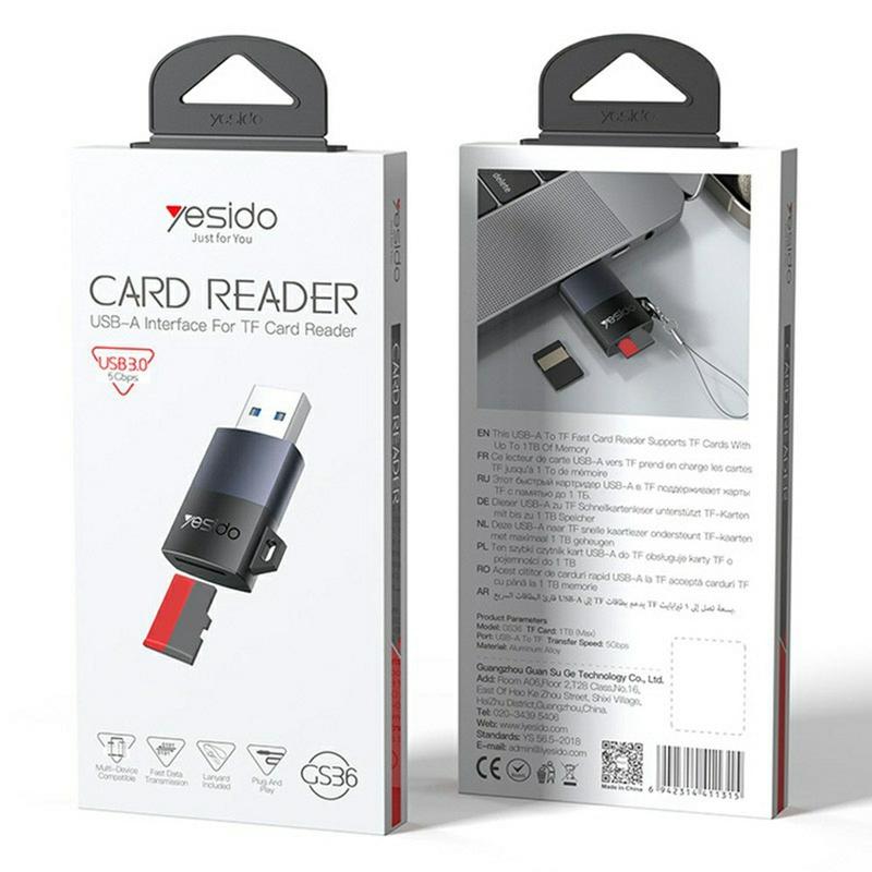 Yesido GS36 Leitor de cartões TF USB 3.0 - Adaptador Plug-and-Play em liga de alumínio 5Gbps