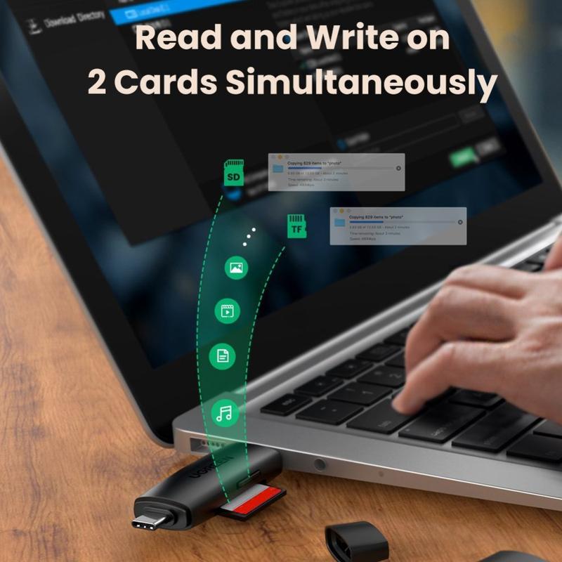 Transfira fotos e vídeos mais rapidamente onde quer que esteja com o leitor de cartões SD e microSD 2 em 1 da UGREEN. Construído com conectores USB-A e USB-C, funciona com uma ampla gama de computadores portáteis, PCs e telemóveis e tablets compatíveis com OTG, tornando-o ideal para viagens, criação de conteúdo e backups rápidos. As ranhuras duplas para cartões permitem-lhe ler e gravar cartões SD e microSD ao mesmo tempo, para que possa copiar ficheiros, pré-visualizar conteúdos ou mover dados entre cartões sem trocar adaptadores.