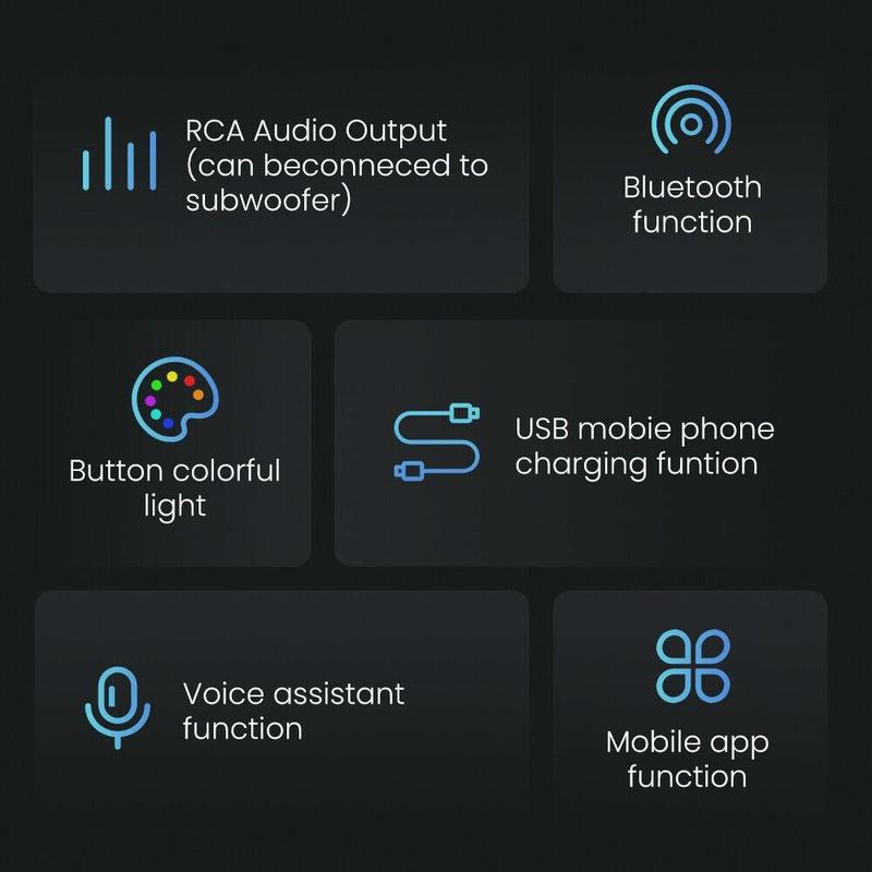 - Saída de áudio RCA com suporte para subwoofer: Inclui saída de áudio RCA, permitindo-lhe ligar um subwoofer para obter graves melhorados e uma qualidade de som superior.