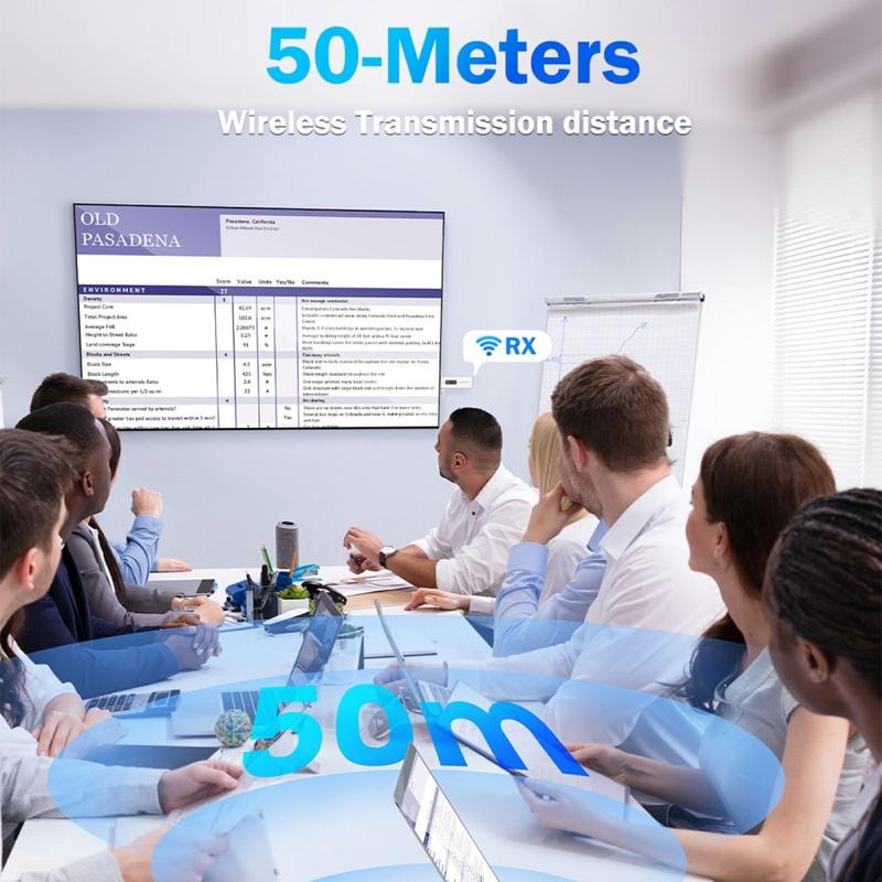 O sistema suporta transmissão de vídeo até 1080P, assegurando uma qualidade de imagem nítida e um desempenho fiável para ecrãs, projectores e monitores. É ideal para apresentações profissionais, reprodução de vídeo e espelhamento de ecrã.