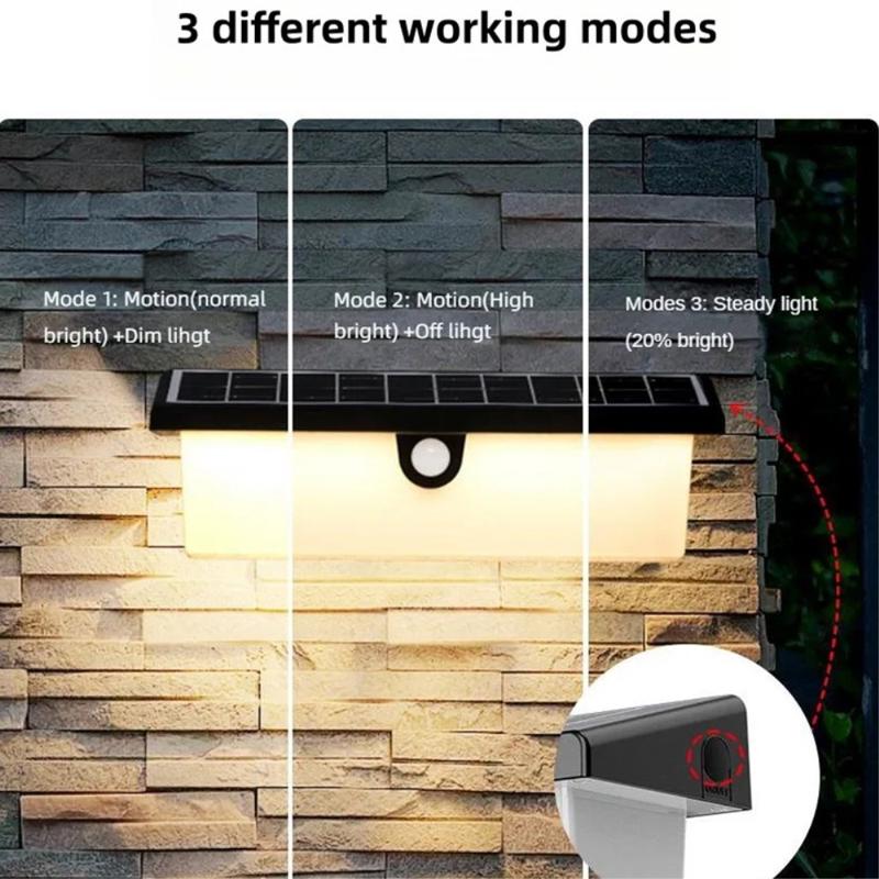 - Três modos inteligentes - PIR motion high-brightness / always-on high-brightness / energy-saving low glow.