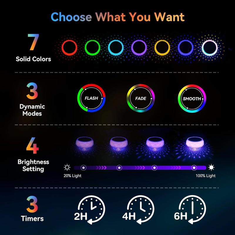 Ilumine os banhos noturnos e ajude a manter a água mais limpa sem cabos nem pilhas. Esta lâmpada flutuante alimentada por energia solar combina um anel de LED RGB de elevado rendimento com uma caixa de desinfeção interna que funciona em conjunto para limitar o crescimento de algas e bactérias. Um painel monocristalino de 5 V reabastece a bateria de lítio de 1200 mAh à luz do dia, depois a lâmpada liga-se automaticamente ao anoitecer para até doze horas de cores vivas. Escolha oito tonalidades sólidas ou três espectáculos de mudança de cor a partir do controlo remoto portátil e defina o temporizador incorporado para 4, 6 ou 8 horas - perfeito para piscinas, banheiras de hidromassagem e lagos ornamentais.