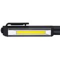 O interrutor posicionado de forma ergonómica aumenta a comodidade de utilização da lanterna. O invólucro é à prova de água, robusto e resistente a danos. A lanterna está equipada com uma pega/clipe móvel e rotativa de 180º. Dois ímanes (um na base e outro no suporte) oferecem possibilidades adicionais de fixação da lanterna.