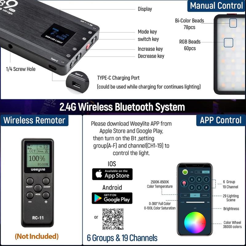 Weeylite RB9 Luz de vídeo RGB portátil 2500-8500 K com controlo por aplicação