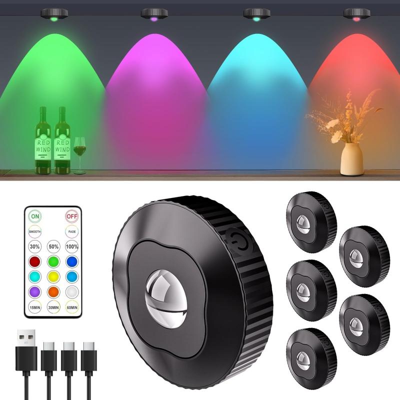 Luzes RGB para armários - Luz ambiente nocturna recarregável por USB com controlo remoto para iluminação ambiente no quarto - 6 peças