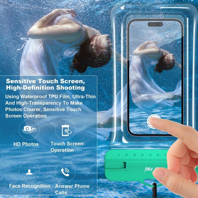 A parte do corpo é feita de material TPU macio de alta qualidade, permite a função de ecrã tátil totalmente disponível, capaz de tirar fotografias com a câmara debaixo de água. Grau de impermeabilidade IPX8 altamente impermeável, adequado para todo o tipo de actividades ao ar livre: passeios de barco, pesca, vela, canoagem, parque temático aquático, campismo, alpinismo, trabalho ao largo da costa, trabalho ao ar livre em dias de chuva, etc.