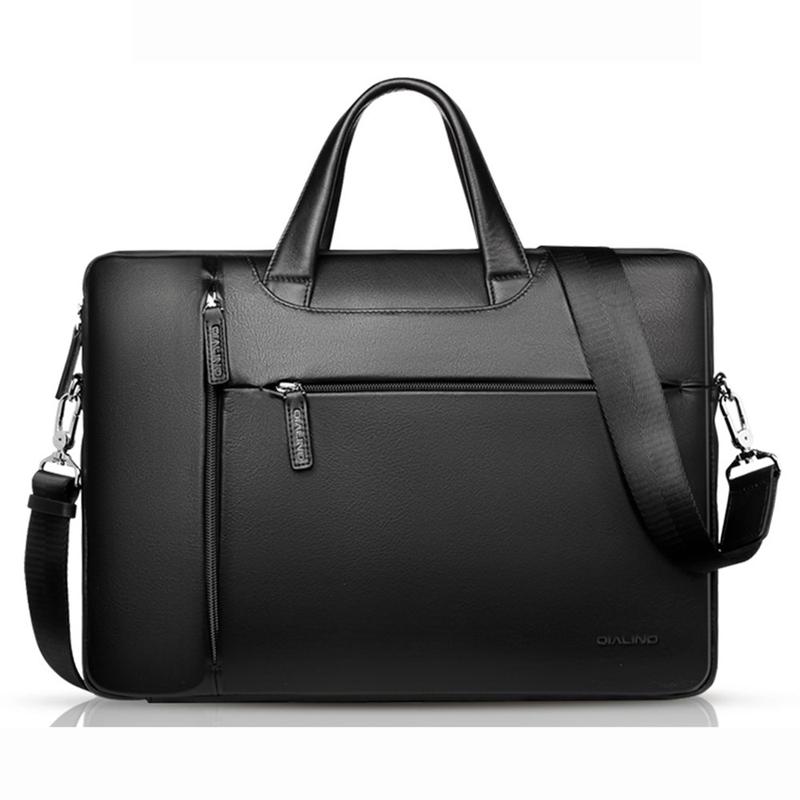 Bolsa para computador portátil em pele genuína Qialino - Bolsa de transporte em pele de vaca de qualidade superior com alça amovível e proteção multi-compartimentos