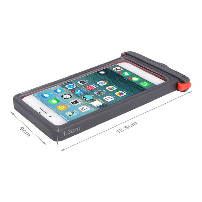 Dimensão externa: 18,5*9m*1,3cm, dimensão interna: 17*8,5*0,9cm, adequada para a maioria dos smartphones até 6,9 polegadas. Este saco seco à prova de água é adequado para actividades na praia, piscina, pesca, natação, passeios de barco, caiaque, mergulho com snorkel e parques aquáticos