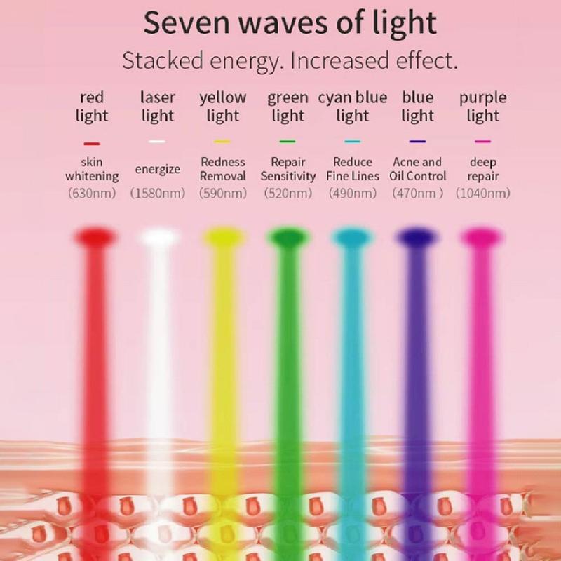 - Terapia LED de 7 cores - Inclui luz vermelha (630nm), azul (460nm), verde (515nm), roxa, amarelo-laranja, ciano e branca para atingir vários problemas de pele.