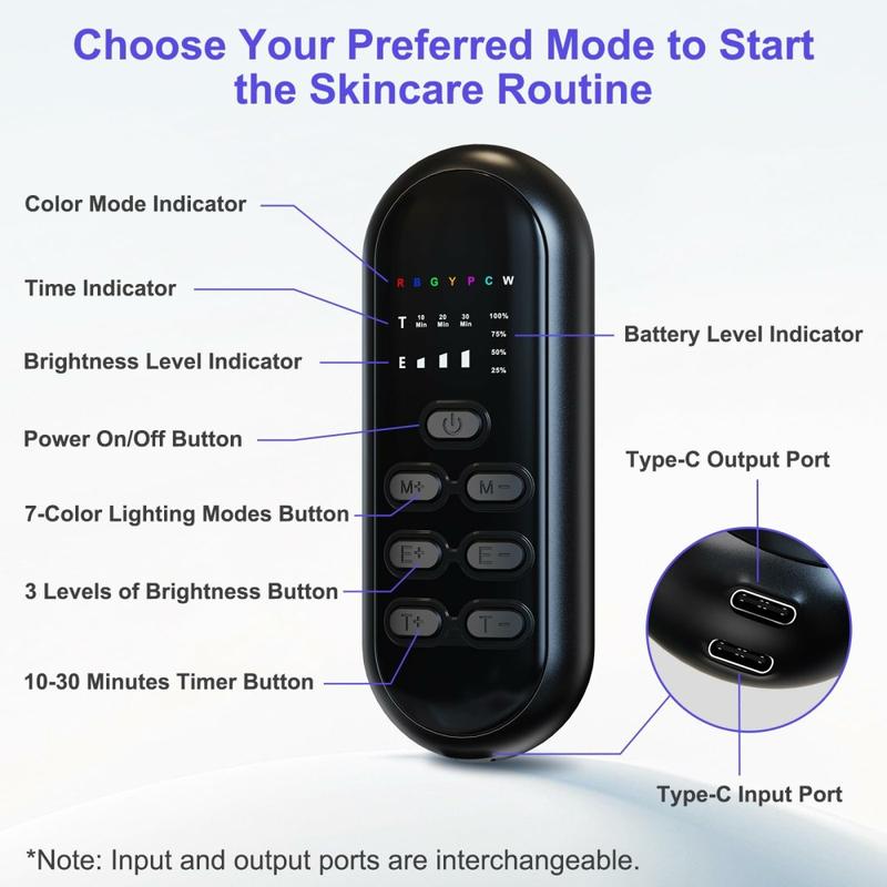 Esta máscara de terapia de luz LED usa 7 cores de luz específicas - vermelho, azul, verde, amarelo, roxo, ciano e branco - para tratar vários problemas de pele, como opacidade, tom irregular, manchas e sinais de envelhecimento. Cada comprimento de onda é projetado para ajudar a obter uma pele com aparência mais saudável por meio de um tratamento suave e não invasivo.