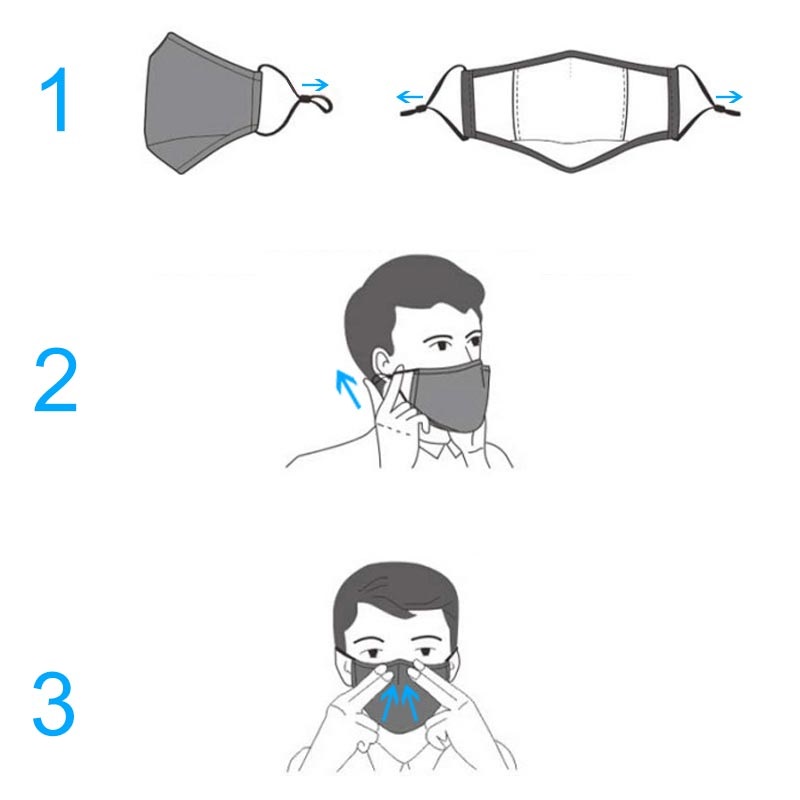 - 2: Coloque a máscara e verifique se está posta firmemente e se cobre totalmente o nariz e a boca