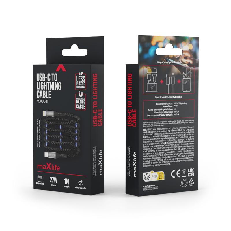 Maxlife MXUC-11 Cabo magnético USB-C para Lightning - 1m, carregamento rápido de 27W, entrançado em nylon, conectores reforçados