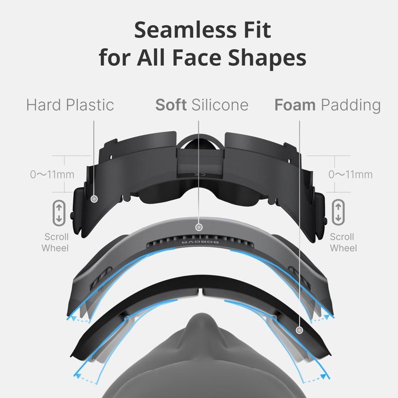 Compatível com todas as correias de cabeça Meta Quest 3, esta máscara facial adapta-se perfeitamente aos seus auscultadores. O seu acolchoamento em silicone macio adapta-se naturalmente a diferentes formas de rosto, garantindo um ajuste seguro e confortável para cada utilizador.