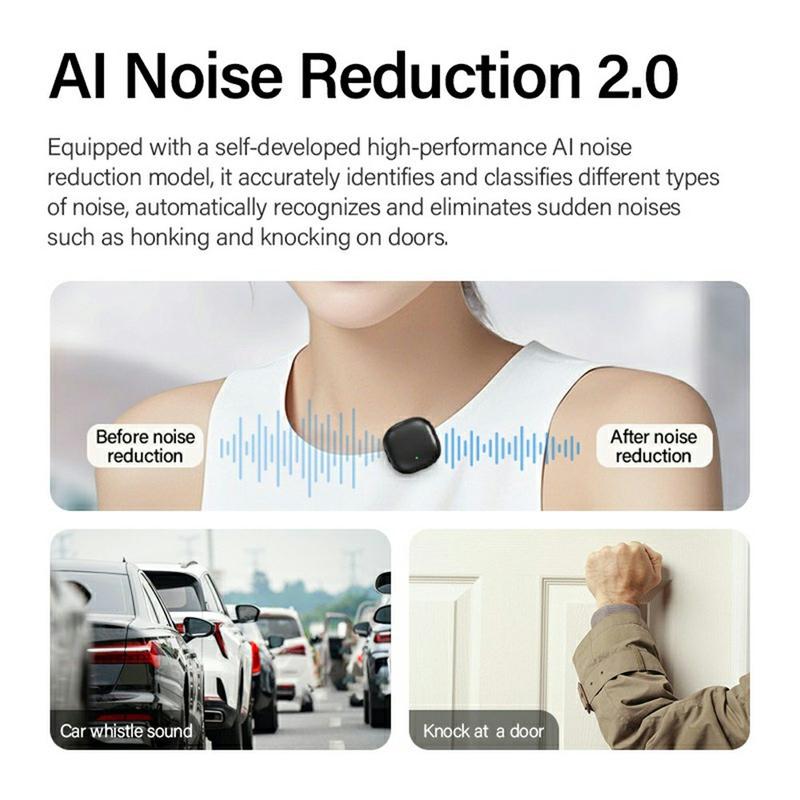 O Mini Microfone de Lapela Sem Fios V36 utiliza o cancelamento de ruído avançado baseado em IA com três modos: Alta Fidelidade (luz verde), Redução de Ruído AI (predefinição, luz amarela) e Redução de Ruído DSP. Isto garante que as suas gravações estão livres de sons de fundo indesejados, mantendo a sua voz natural e clara - perfeito para vlogs, entrevistas, transmissões ao vivo e podcasts.