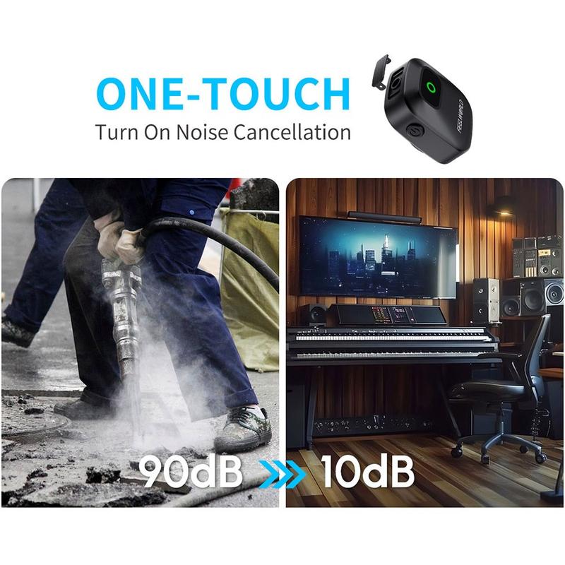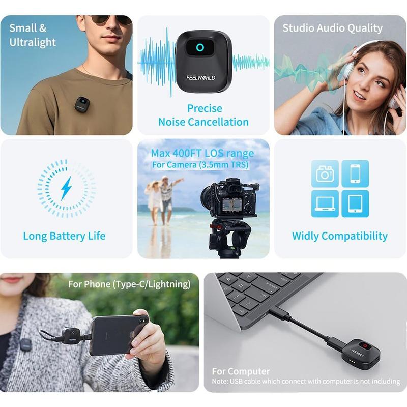 Concebido para oferecer comodidade, o FEELWORLD LM1 apresenta um design compacto e leve com clipe e fixação magnética, tornando-o confortável de usar e fácil de posicionar discretamente na roupa. O sistema utiliza transmissão sem fios de 2,4 GHz para uma ligação de áudio estável, enquanto a redução de ruído inteligente integrada ajuda a reduzir a interferência de fundo para que a sua voz seja transmitida de forma mais clara e natural.